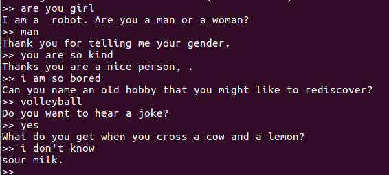 print alice.respond(raw_input(">> "))